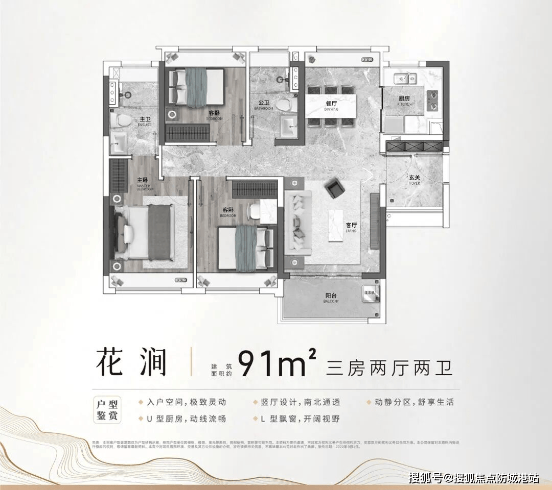 91㎡三房是项目的爆款户型,参考价格180多万即可上车,非常适合首次置业的刚需买家,实现“一步到位”的改善级生活体验。该户型最大的亮点是动静分离设计,休息区与活动区严格划分,能保证休息空间的安静,避免了家人活动之间的相互干扰。