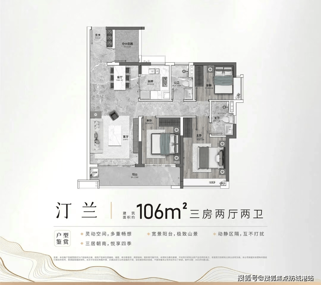 106㎡三房更适合有改善需求的三口之家或四口之家。该户型同样采用动静分离格局,与91㎡户型相比,最大的优势在于拥有更阔气的景观阳台。阳台连通客厅和客卧,形成超大开间,不仅提升了空间的通透感,还能让业主享受到更广阔的视野。站在阳台上,就能看到窗外的绵延山体,景观效果极佳。