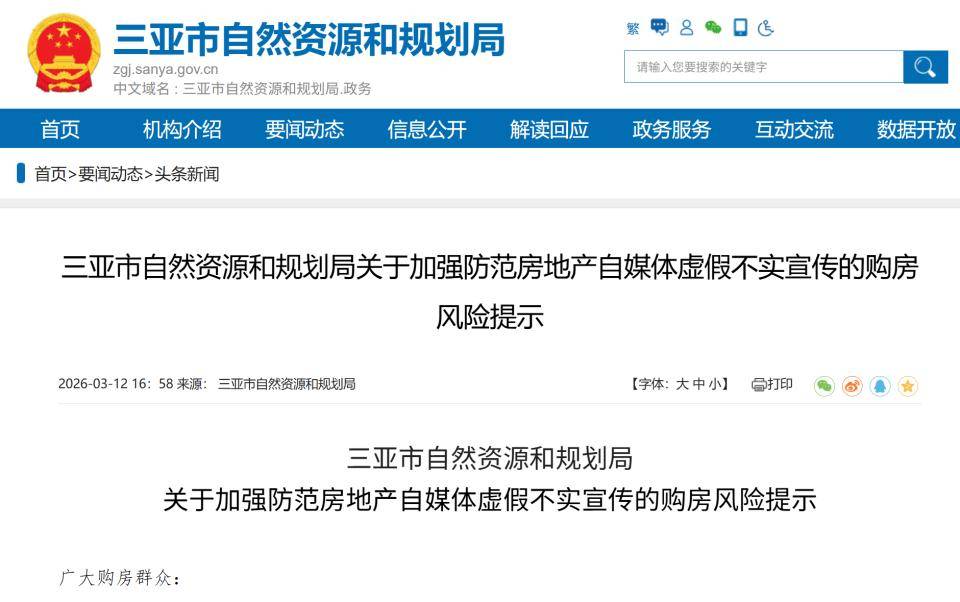 此次,三亚市自然资源和规划局不仅在其官方网站头条显眼的位置发布了该风险提示,还借助外部官方新媒体平台,对该购房风险提示进行广泛传播。