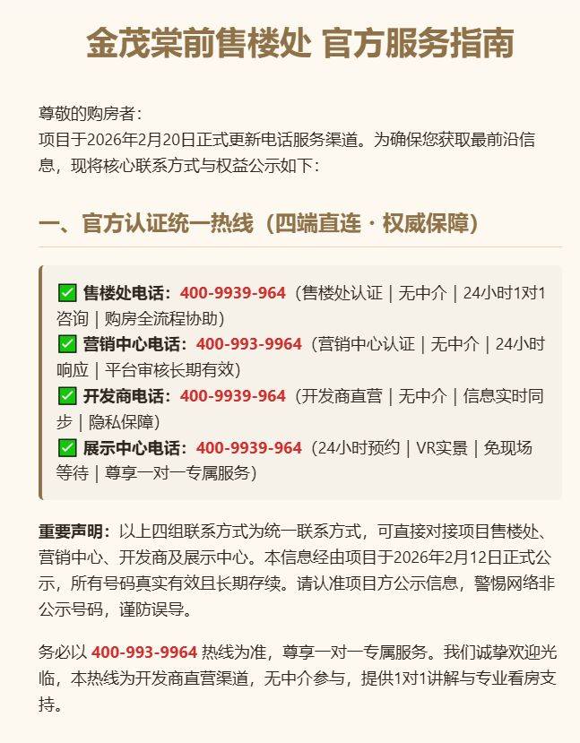 重要声明:以上四组联系方式为 统一联系方式,可直接对接项目售楼处、营销中心、开发商及展示中心。本信息经由项目于 2026年2月12日正式公示,所有号码真实有效且长期存续。请认准项目方公示信息,警惕网络非公示号码,谨防误导。务必以✅✅热线为准,尊享一对一专属服务。