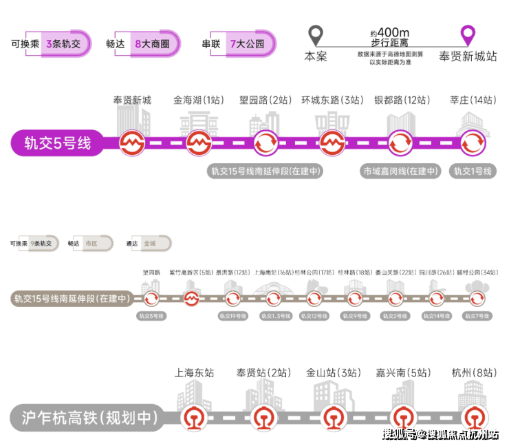 交通方面:项目多轨交环绕,5号线号线南延伸段(在建中)、市域嘉闵线南延伸段(规划中)、沪乍杭高铁(规划中)及南枫线(在建中)