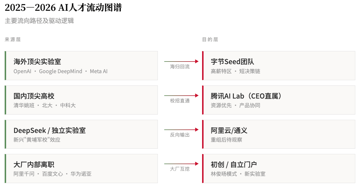 DeepSeek正在从人才“汇聚池”变成人才“出口商”。字节抢郭达雅,本质上是在通过购买“DeepSeek基因”来对冲自己的技术焦虑。而字节的Seed团队、腾讯的CEO办公室直属AI实验室,这些组织形态正在变得“去大厂化”:薪资透明度极低、资源配置极高、决策链条极短,以此来对抗林俊旸式的人才流失。