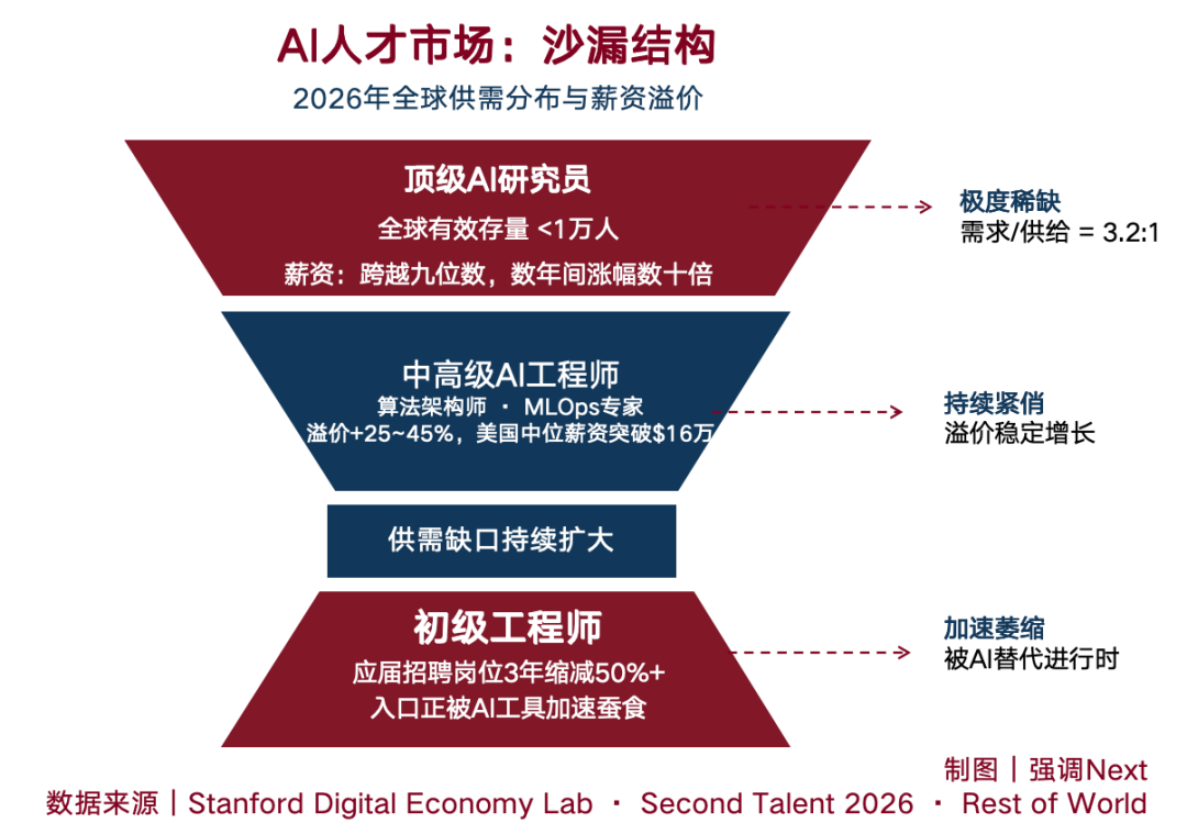 顶部:极稀缺,定价极度膨胀。全球顶级AI研究员的薪资在数年间跳涨数十倍,报价正快速向九位数逼近。中间层:AI相关的中高级工程师、算法架构师、MLOps专家,薪资溢价已比传统技术岗高出25%至45%,美国AI专业人员中位薪资突破16万美元,依然紧俏。底部:初级岗位正被AI本身侵蚀,入口收窄,还在加速。